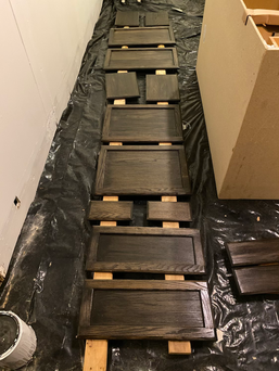The first thing we did when we got into the house was gut the entire kitchen. There was ALOT of water damage and nothing could be saved. After looking at a million samples we decided we wanted a black stained cabinet. Without custom ordering our cabinets (which we didn't even look into prices for) black stained was very rare. IKEA was the only place we could find exactly what we were looking for. That's when I found unfinished cabinets at Lowes that ran $50-$200 cheaper per cabinet than their finished versions. After a YouTube tutorial I set to work sanding, staining, and finishing all of the cabinets. In total there were 8 cabinets and it took about 3 days to finish. After finishing them all we decided to change up the top cabinets and make them white which added an extra 2 days to our project... but I am happy we did and think it brightens the kitchen up so much more. We still have a few more cabinets to order as we put the kitchen together but in the end by going unfinished we saved about $1500.